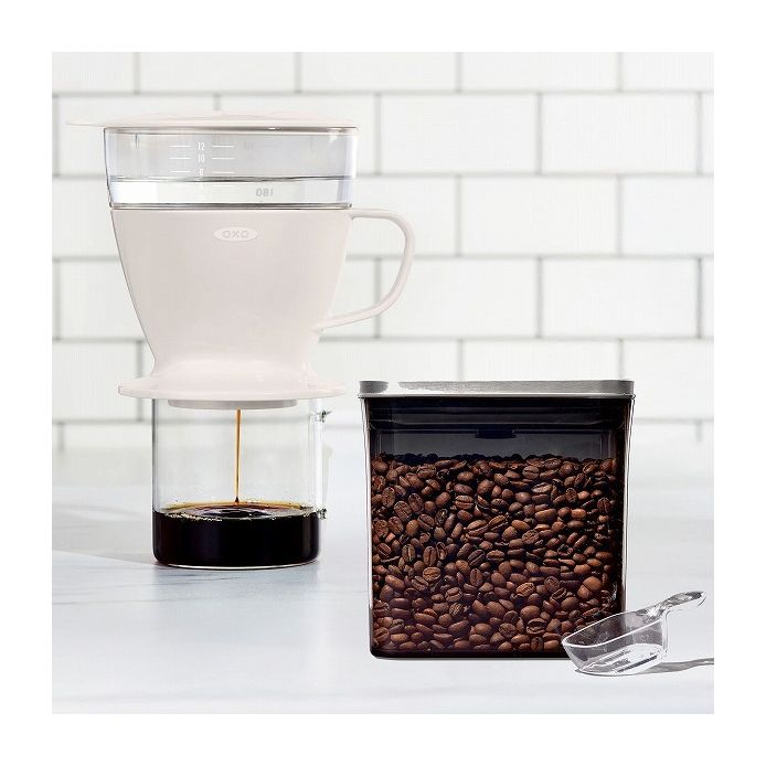 フタの真ん中についているボタンを押すだけで開閉ができるポップコンテナの、コーヒー豆や茶葉の保存に適したモデルです。